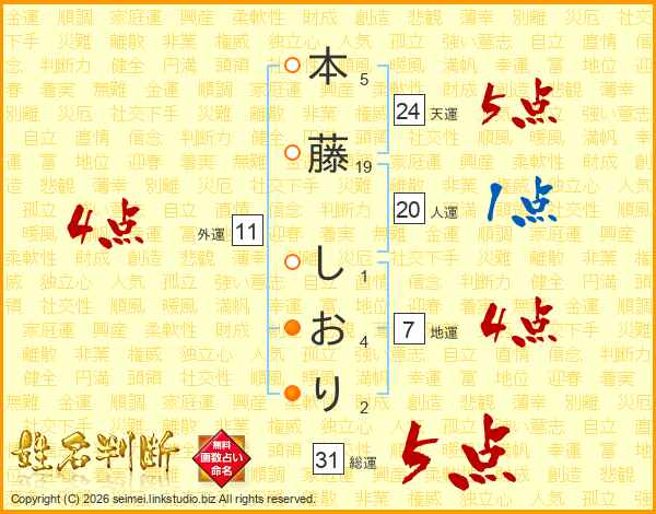 生活面を象徴する運勢です。外部から受ける影響力を表し、結婚運、家庭運や職場、環境への順応性を表します。総運から人運を引いた画数。姓や名が1文字の場合を除く。