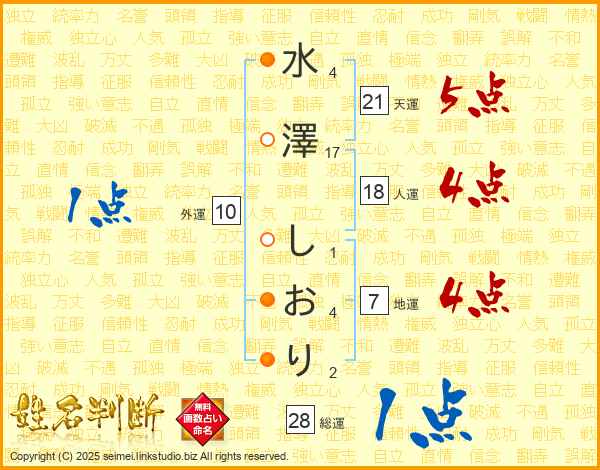 生活面を象徴する運勢です。外部から受ける影響力を表し、結婚運、家庭運や職場、環境への順応性を表します。総運から人運を引いた画数。姓や名が1文字の場合を除く。