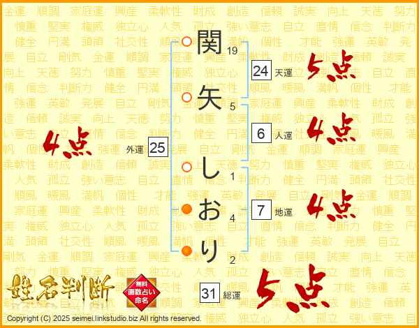 関(19画)矢(5画) し(1画)お(4画)り(2画)