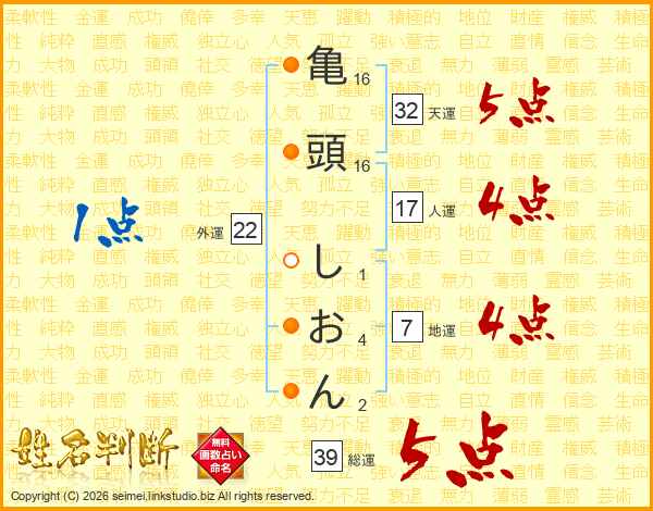亀頭しおんさんの総運は39画の5点!