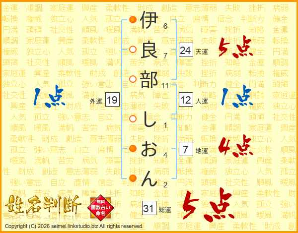 伊(6画)良(7画)部(11画) し(1画)お(4画)ん(2画)