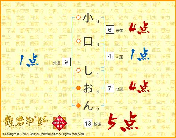 小(3画)口(3画) し(1画)お(4画)ん(2画)