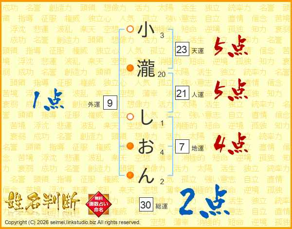 小(3画)瀧(20画) し(1画)お(4画)ん(2画)