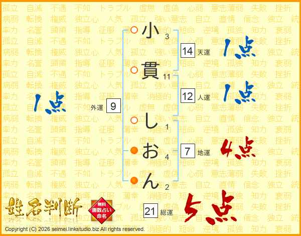 小(3画)貫(11画) し(1画)お(4画)ん(2画)