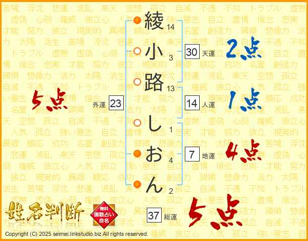 綾(14画)小(3画)路(13画) し(1画)お(4画)ん(2画)