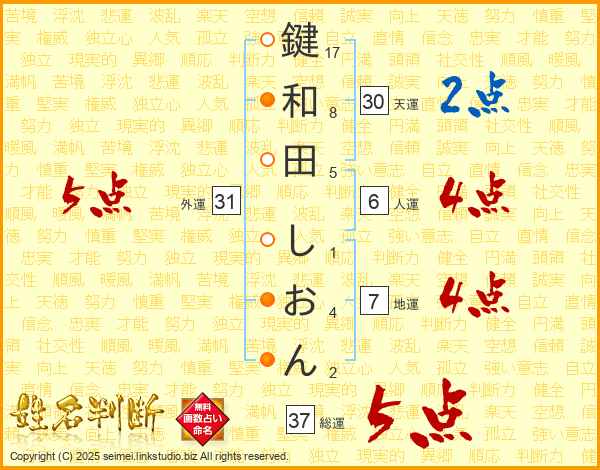 鍵(17画)和(8画)田(5画) し(1画)お(4画)ん(2画)