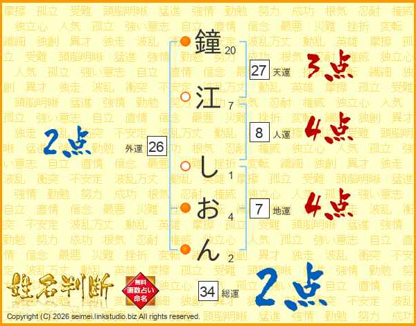 鐘(20画)江(7画) し(1画)お(4画)ん(2画)