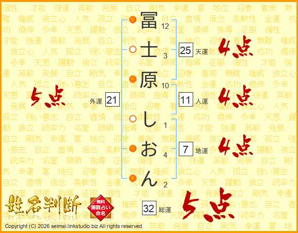冨(12画)士(3画)原(10画) し(1画)お(4画)ん(2画)