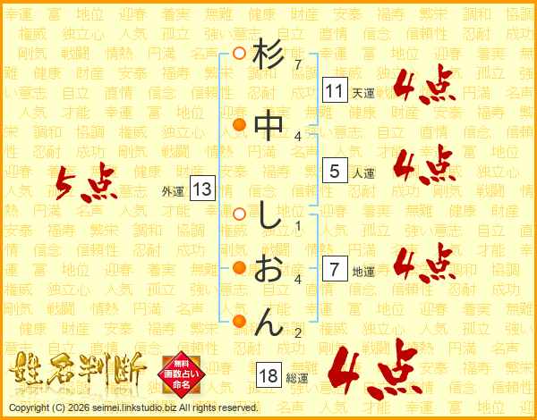 杉(7画)中(4画) し(1画)お(4画)ん(2画)