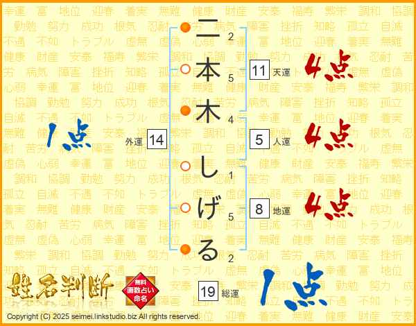 二(2画)本(5画)木(4画) し(1画)げ(5画)る(2画)