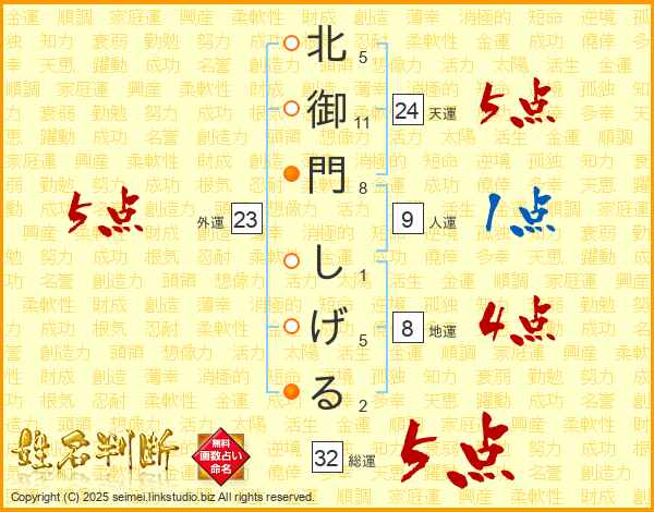 北(5画)御(11画)門(8画) し(1画)げ(5画)る(2画)
