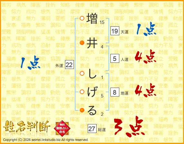 増(15画)井(4画) し(1画)げ(5画)る(2画)