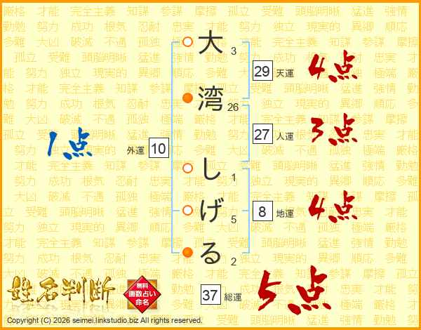 大(3画)湾(26画) し(1画)げ(5画)る(2画)