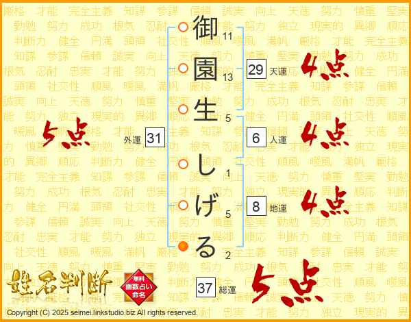 御(11画)園(13画)生(5画) し(1画)げ(5画)る(2画)