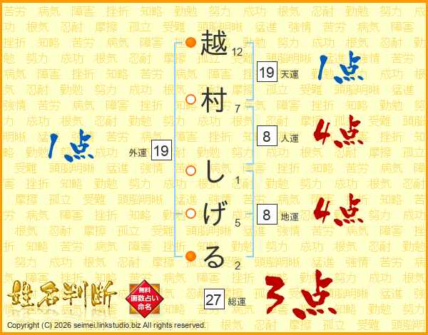 越(12画)村(7画) し(1画)げ(5画)る(2画)