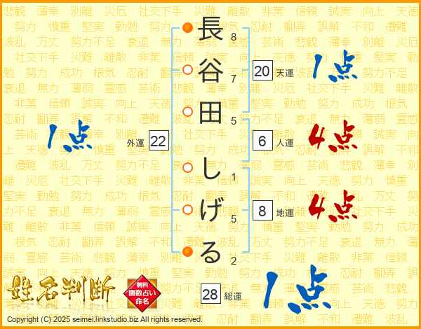 長(8画)谷(7画)田(5画) し(1画)げ(5画)る(2画)