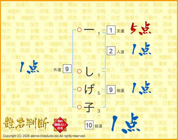 生活面を象徴する運勢です。外部から受ける影響力を表し、結婚運、家庭運や職場、環境への順応性を表します。総運から人運を引いた画数。姓や名が1文字の場合を除く。