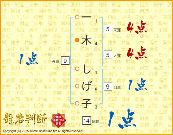 一(1画)木(4画) し(1画)げ(5画)子(3画)