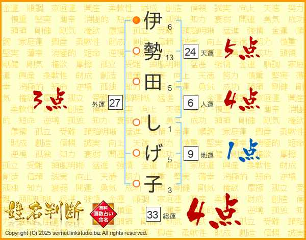伊(6画)勢(13画)田(5画) し(1画)げ(5画)子(3画)