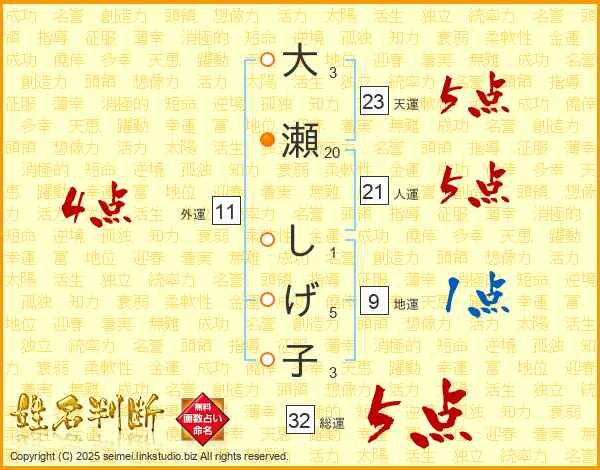 大瀬しげ子さんの総運は32画の5点!