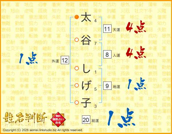 太(4画)谷(7画) し(1画)げ(5画)子(3画)