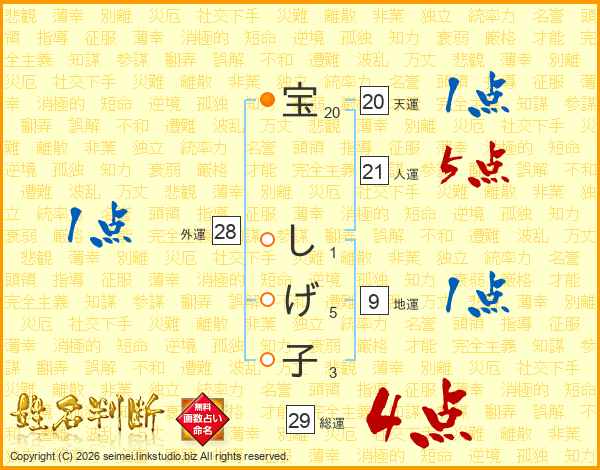 生活面を象徴する運勢です。外部から受ける影響力を表し、結婚運、家庭運や職場、環境への順応性を表します。総運から人運を引いた画数。姓や名が1文字の場合を除く。