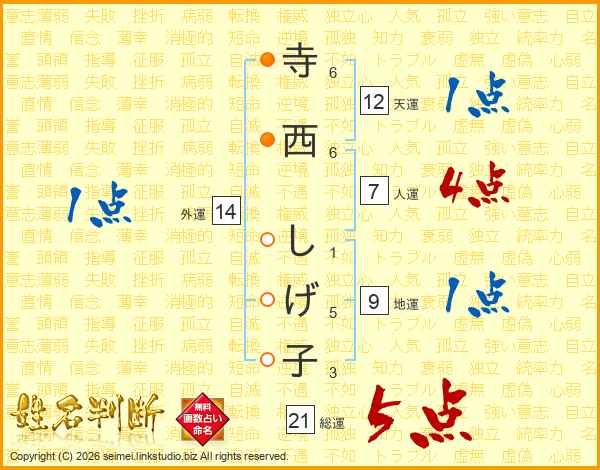 寺(6画)西(6画) し(1画)げ(5画)子(3画)