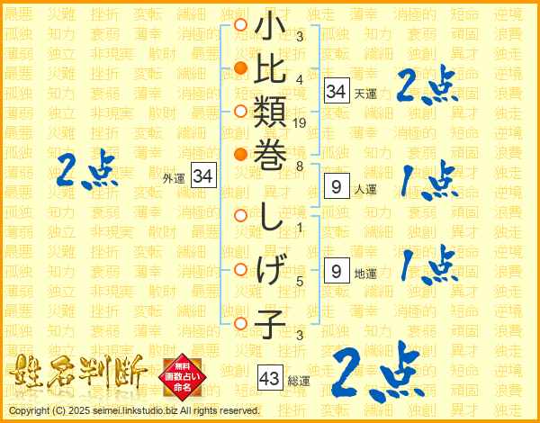 小(3画)比(4画)類(19画)巻(8画) し(1画)げ(5画)子(3画)