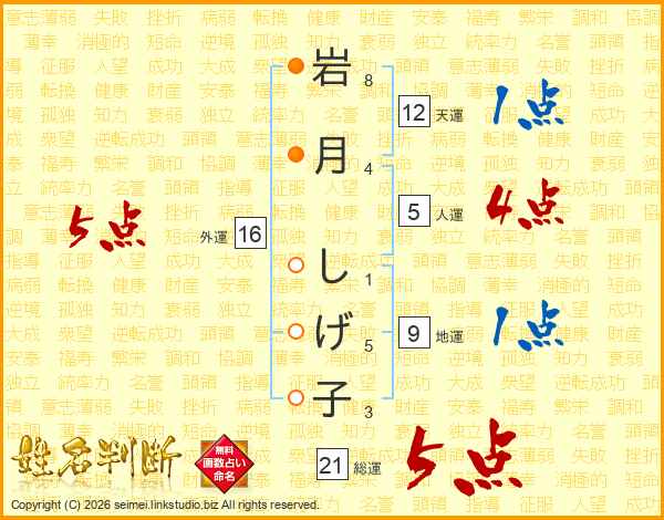 岩月しげ子さんの総運は21画の5点!