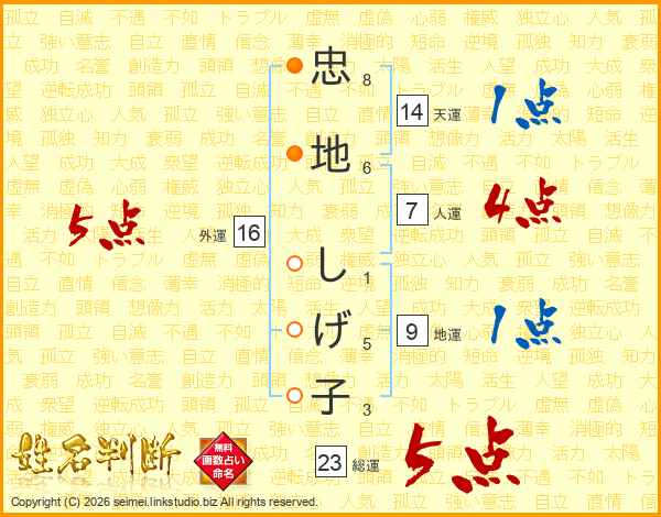 忠(8画)地(6画) し(1画)げ(5画)子(3画)