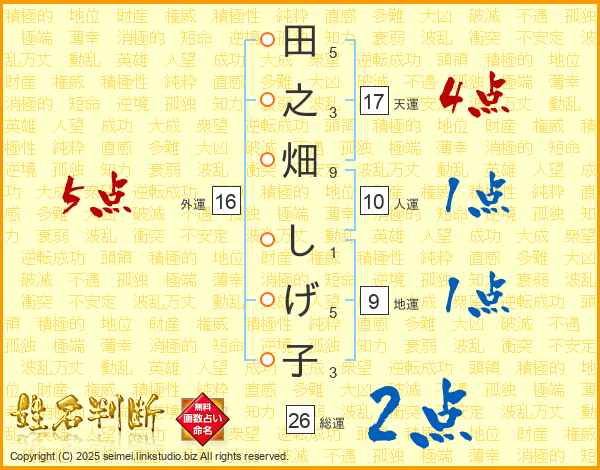 田(5画)之(3画)畑(9画) し(1画)げ(5画)子(3画)