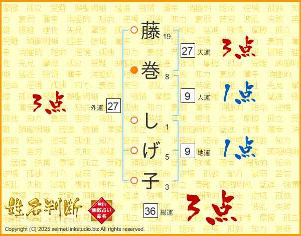 藤(19画)巻(8画) し(1画)げ(5画)子(3画)