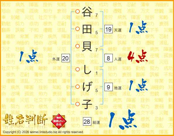 谷田貝しげ子さんの総運は28画の1点!