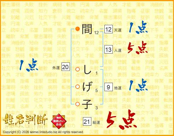 間しげ子さんの総運は21画の5点!