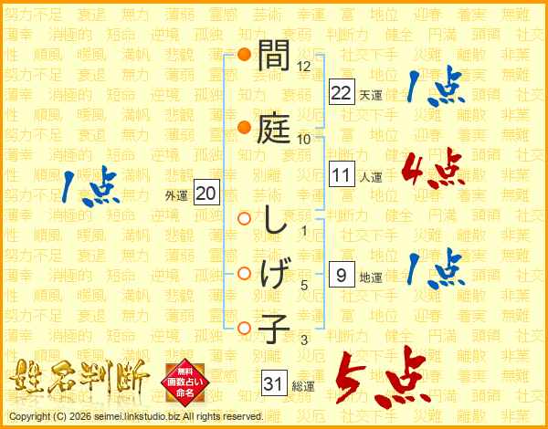 生活面を象徴する運勢です。外部から受ける影響力を表し、結婚運、家庭運や職場、環境への順応性を表します。総運から人運を引いた画数。姓や名が1文字の場合を除く。