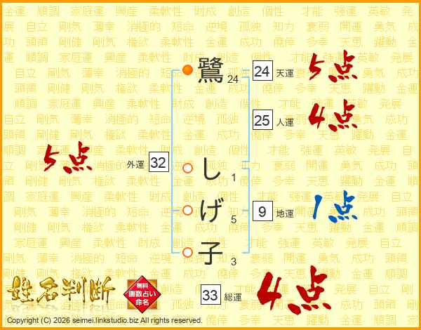 鷺しげ子さんの総運は33画の4点!