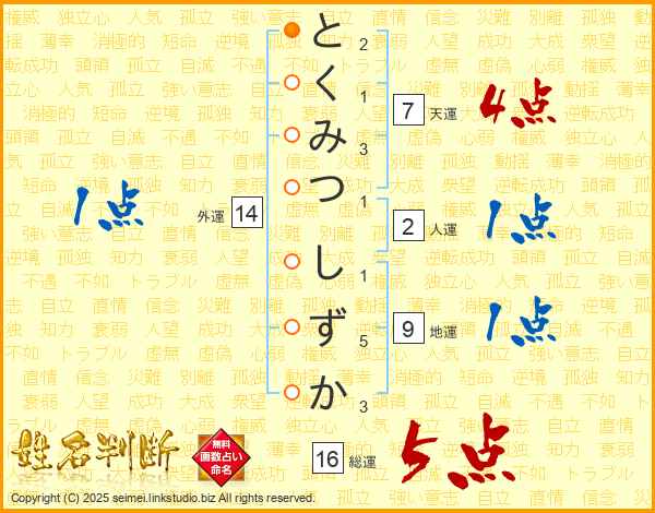 生活面を象徴する運勢です。外部から受ける影響力を表し、結婚運、家庭運や職場、環境への順応性を表します。総運から人運を引いた画数。姓や名が1文字の場合を除く。