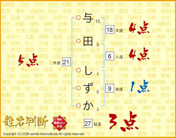 与(13画)田(5画) し(1画)ず(5画)か(3画)