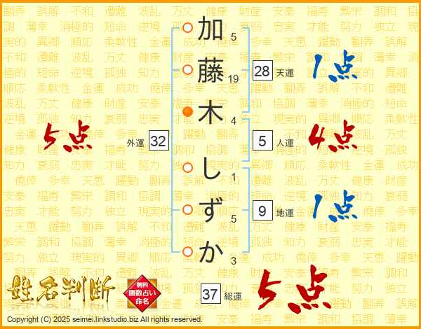 加(5画)藤(19画)木(4画) し(1画)ず(5画)か(3画)