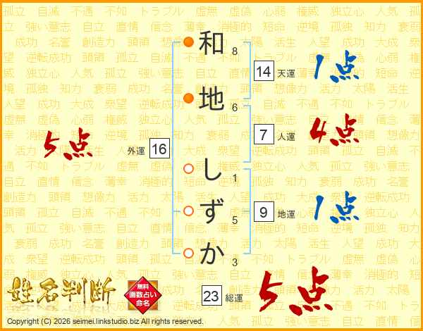 生活面を象徴する運勢です。外部から受ける影響力を表し、結婚運、家庭運や職場、環境への順応性を表します。総運から人運を引いた画数。姓や名が1文字の場合を除く。