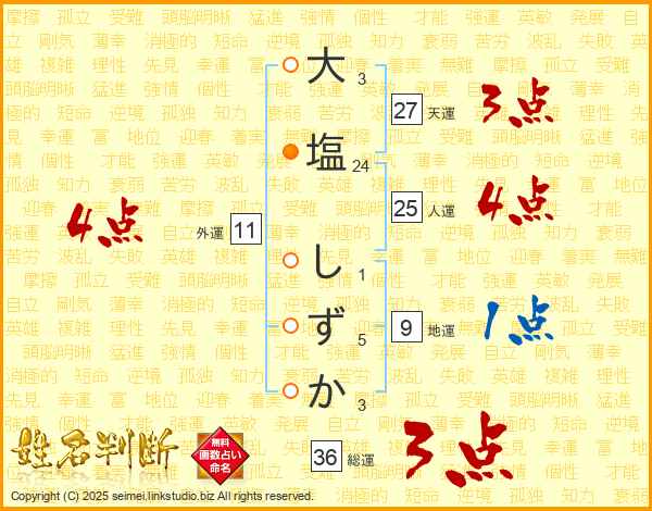 大(3画)塩(24画) し(1画)ず(5画)か(3画)