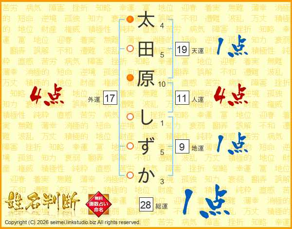 生活面を象徴する運勢です。外部から受ける影響力を表し、結婚運、家庭運や職場、環境への順応性を表します。総運から人運を引いた画数。姓や名が1文字の場合を除く。