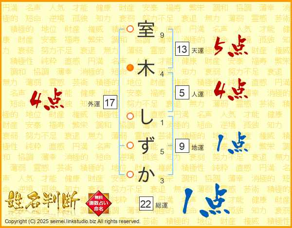 室(9画)木(4画) し(1画)ず(5画)か(3画)