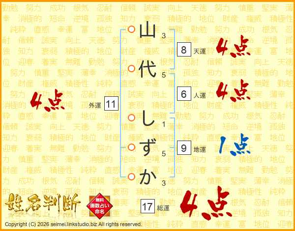 山(3画)代(5画) し(1画)ず(5画)か(3画)