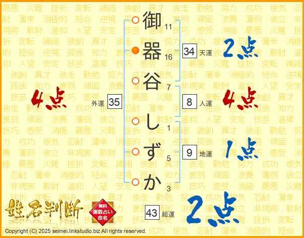 生活面を象徴する運勢です。外部から受ける影響力を表し、結婚運、家庭運や職場、環境への順応性を表します。総運から人運を引いた画数。姓や名が1文字の場合を除く。