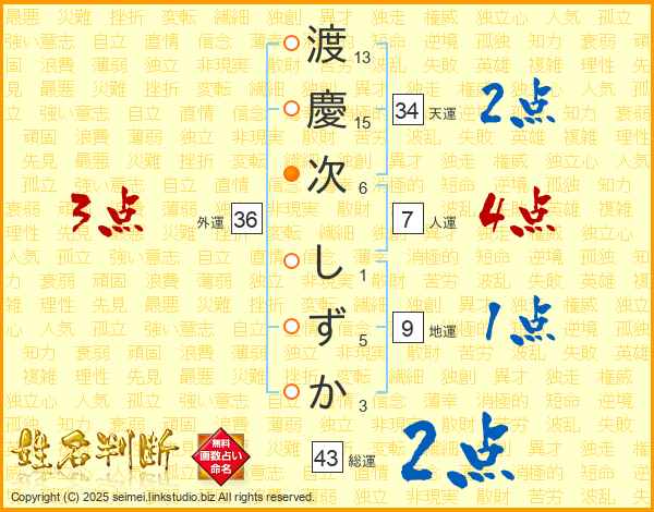 渡(13画)慶(15画)次(6画) し(1画)ず(5画)か(3画)