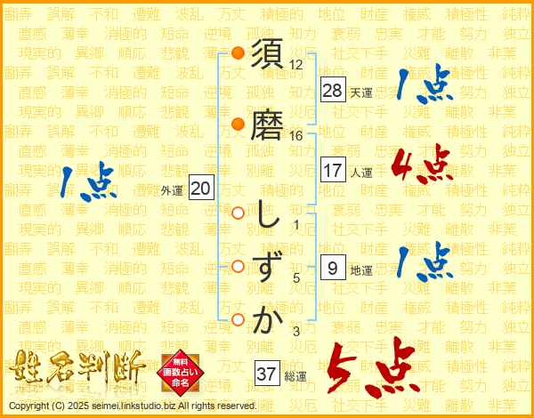 須(12画)磨(16画) し(1画)ず(5画)か(3画)