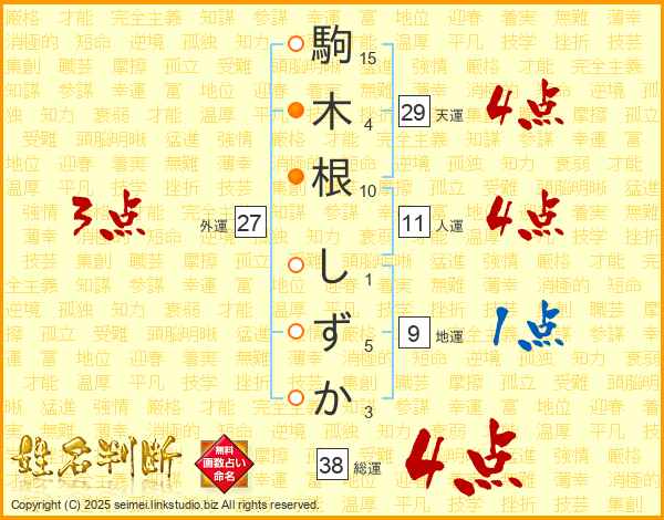 駒木根しずかさんの総運は38画の4点!
