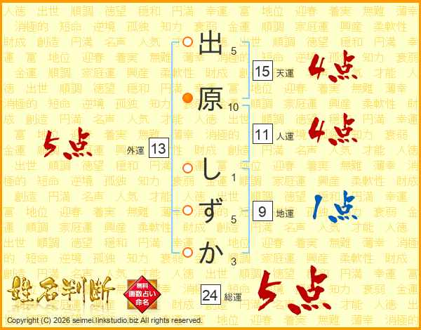 出(5画)原(10画) し(1画)ず(5画)か(3画)