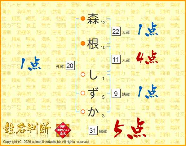 森根しずかさんの総運は31画の5点!